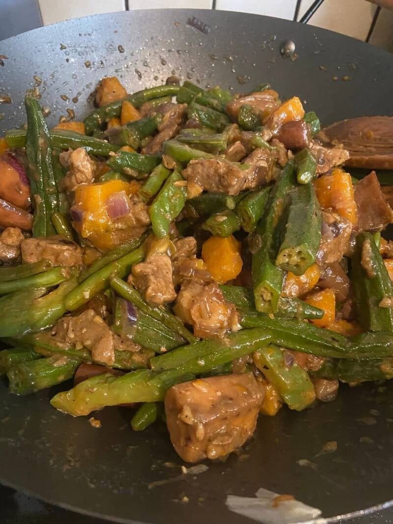 Een mix van knapperige groenten en kip, roergebakken en geserveerd in een hartige, licht ingedikte saus, op basis van sojasaus en oestersaus